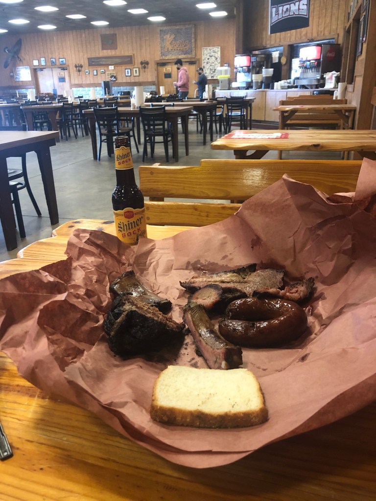 Total Cost: $22. Brisket, burnt ends, spare ribs, sausage, coleslaw, & Shiner Bock