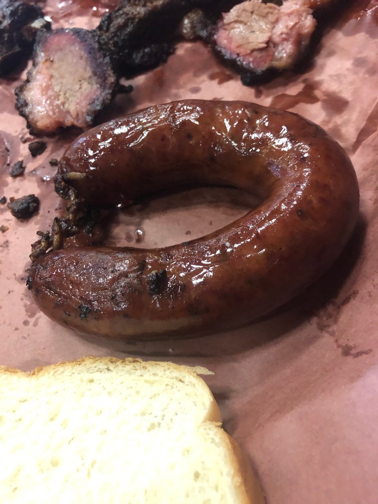 Description: Casing had a nice snap to it. This sausage was nowhere near as greasy as Smitty’s was. That said, I could handle one bite as this was the fattiest blended and most over-seasoned sausages I’ve ever had. The internal meat blend also had a very loose hold to it, which led it to crumble apart rather easily compared to other sausages. Wouldn’t recommend this one
