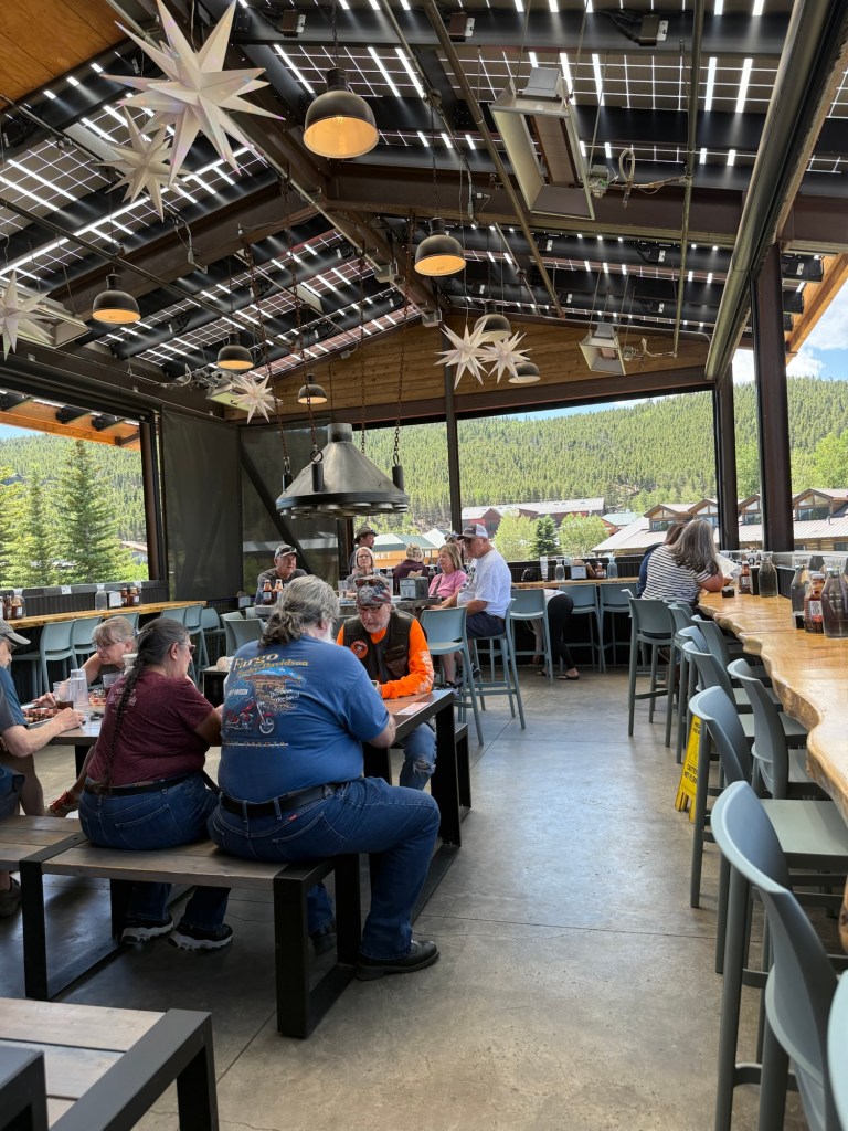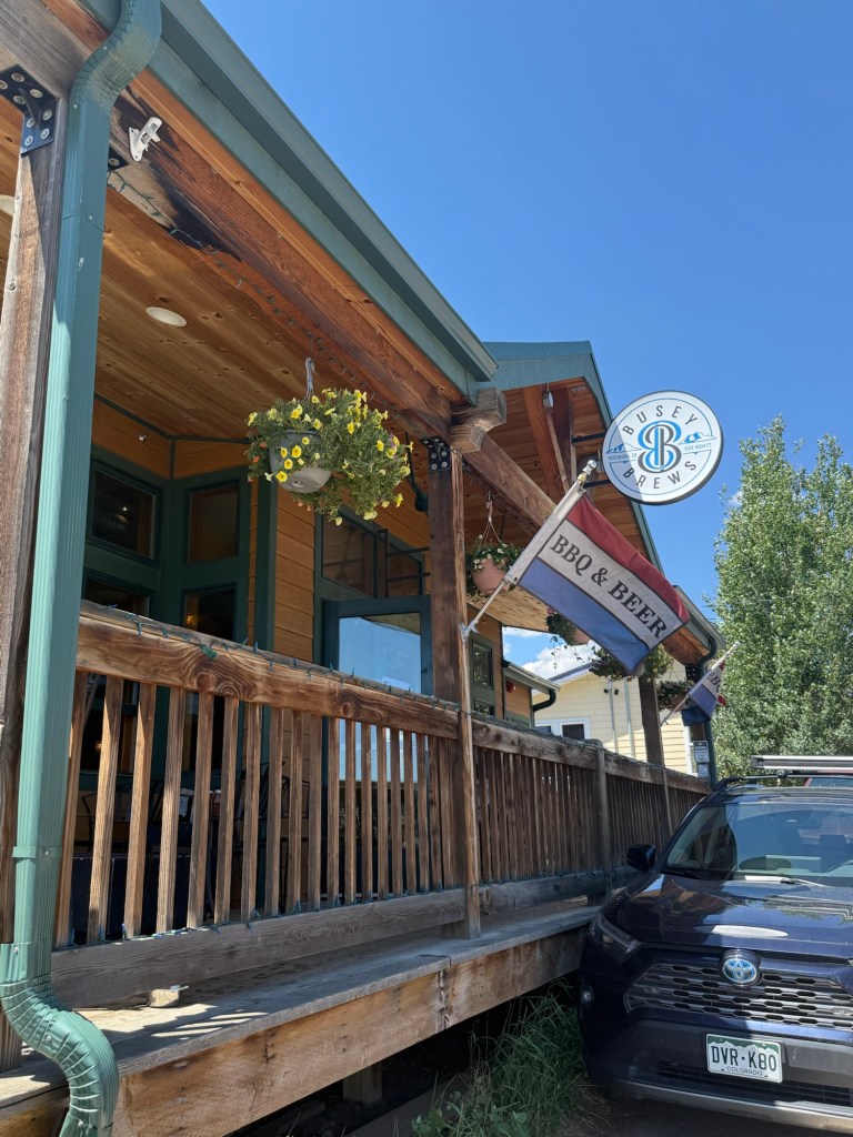 Interior Description: Rustic mountain is probably the best way to describe Busey’s interior. With corrugated walls, concrete floors, and custom wooden countertop seating surrounding a unique fire pit seating option, it creates an industrial, but inviting environment. Indoor seating options with a full bar for probably 30-40 people, with additional exterior seating that I believe is dog-friendly. It’s the perfect place to stop, be it after a long day of skiing and needing a rest before starting the drive back, or just stopping in for a quick pint or bite of BBQ after a well-earned day in the mountains