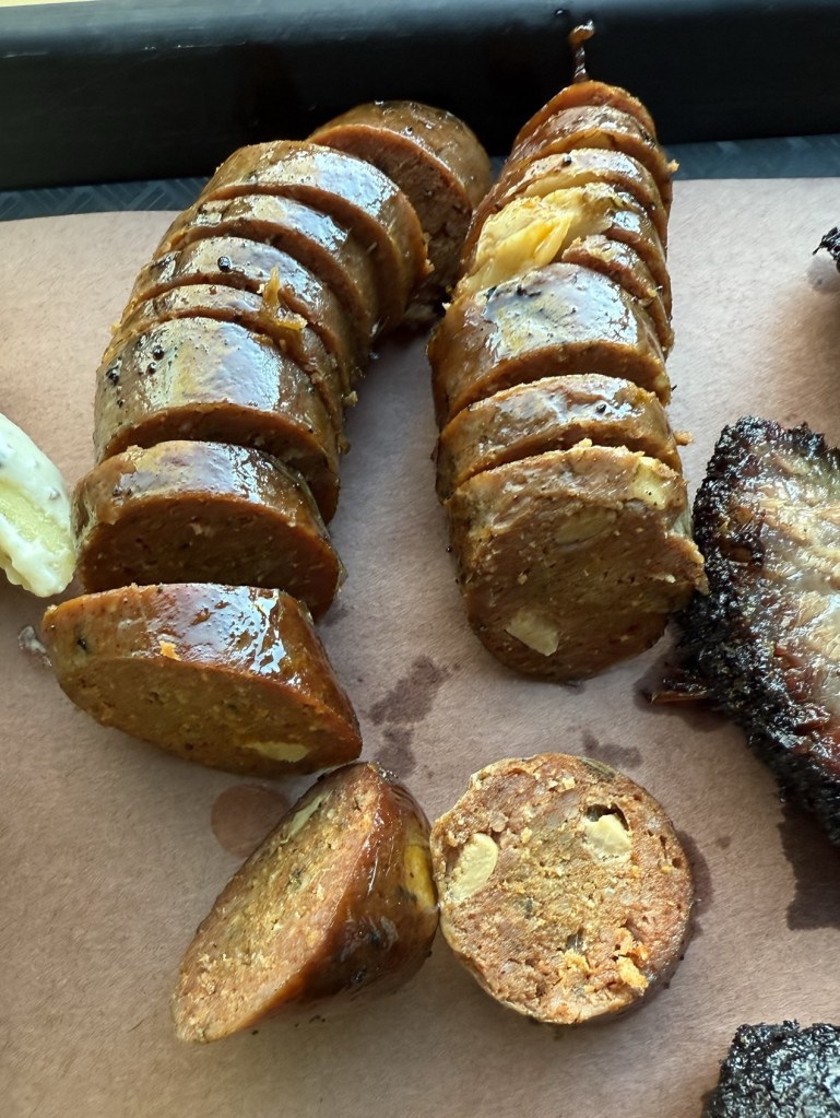 Description: This had a nice little bit of heat and seasoning to each piece, which is served sliced up for you. Big chunks of garlic were visible in most of the pieces, but they don’t overpower it or make it too much. Interior texture was a little too creamy and crumbly, but still really enjoyable. They also still had a light snap to the casing, as well as a nice smokiness that comes through with the heat. Would get this again