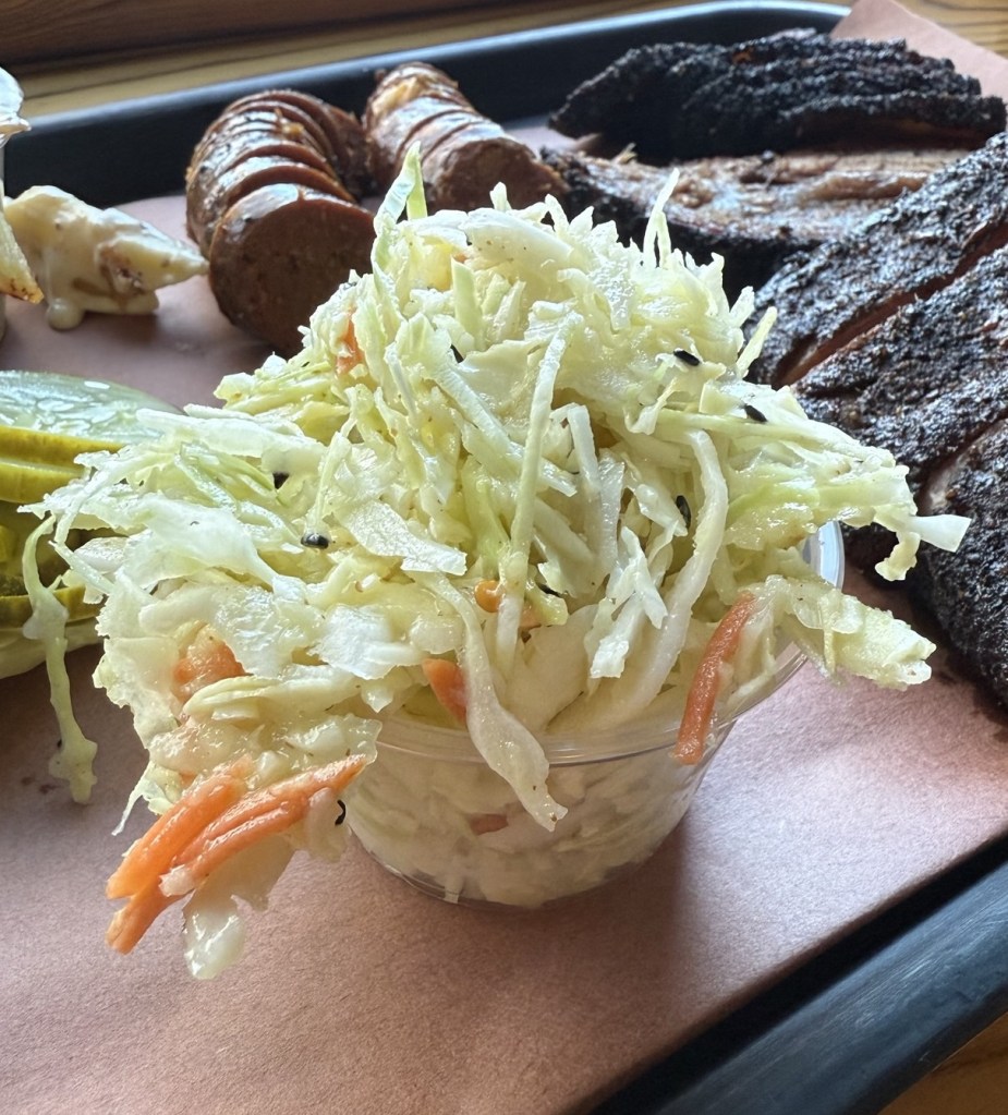 Description: White cabbage, mostly with a little bit of shredded carrot and toasted black sesame seeds. Comes off as a much more of an Asian style coleslaw, which is very refreshing and cuts the meat perfectly. Light vinegar and no mayo to it, from what I can tell, makes it a non-typical, but very enjoyable coleslaw. While I would get it again, it also needs a little salt or a dash more of acid. Very sesame seed-forward in the flavor, with sesame oil being the main flavor driving forward. If you’re looking for a traditional coleslaw, this ain’t it, but it’s still really good overall and a rare Asian influenced option in Denver