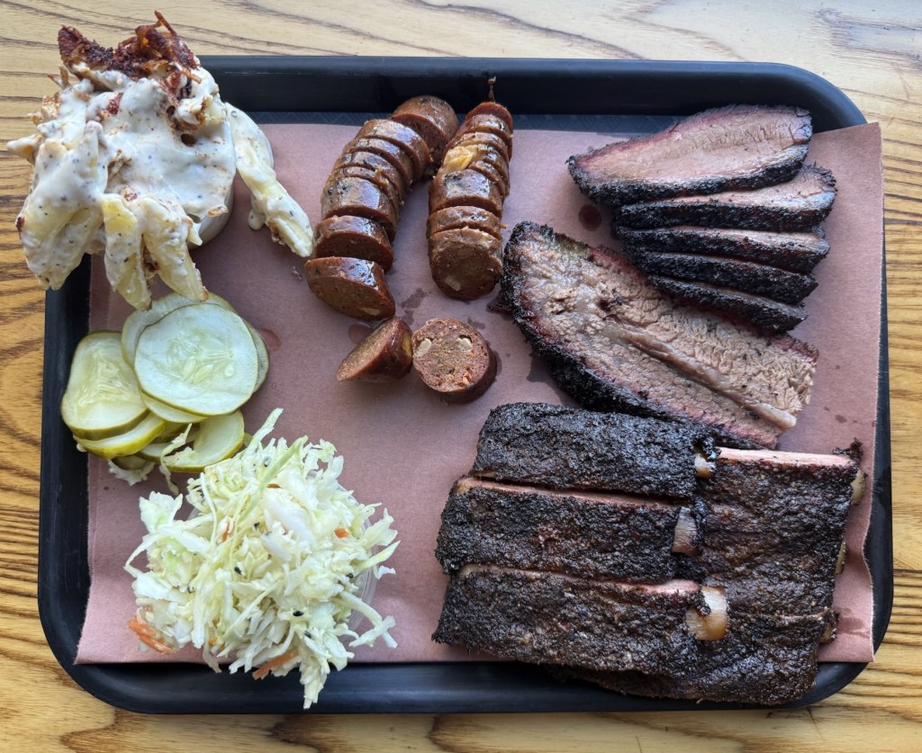Total Cost: $80.59 with Tip. 1/2lb brisket, half rack of ribs, 1 Garlic sausage, and for sides Mac & Cheese, and Coleslaw