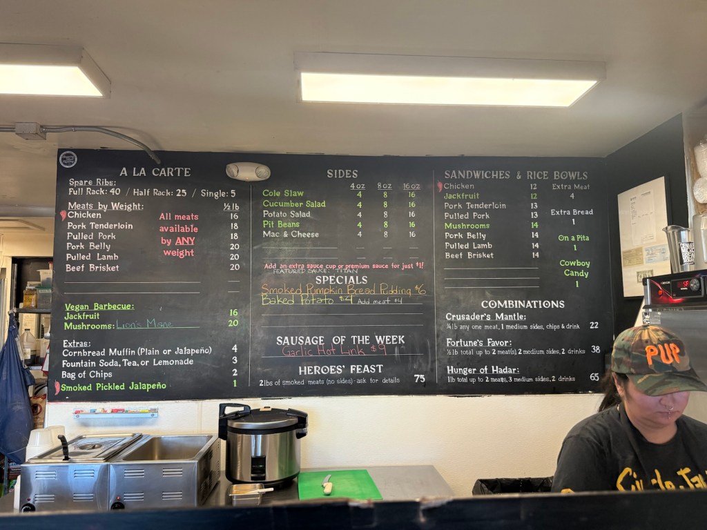 Interior Description: Small little walk-up spot, tucked in off the road behind Our Mutual Friend Brewing. Similar to when it was still Owlbear, they have kept the Dungeons and Dragons theme going with characters lining the walls and the names of their BBQ sauces. Interior has classic walk-up cafeteria-style ordering, with daily specials not found anywhere else, in addition to rice bowls, sandwiches, & meats sold by the pound. Can seat maybe 10-15 max inside, but you can order and walk next door to OMF Brewing and grab a table there with your tray, as long as you’re buying a beer from them that is