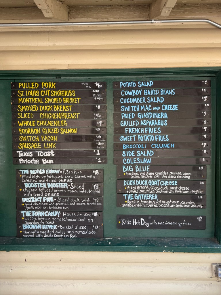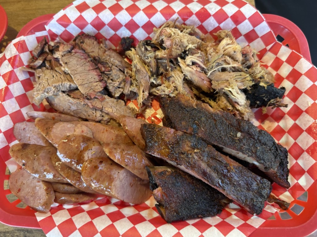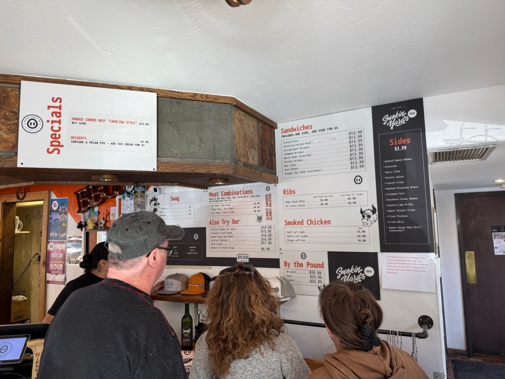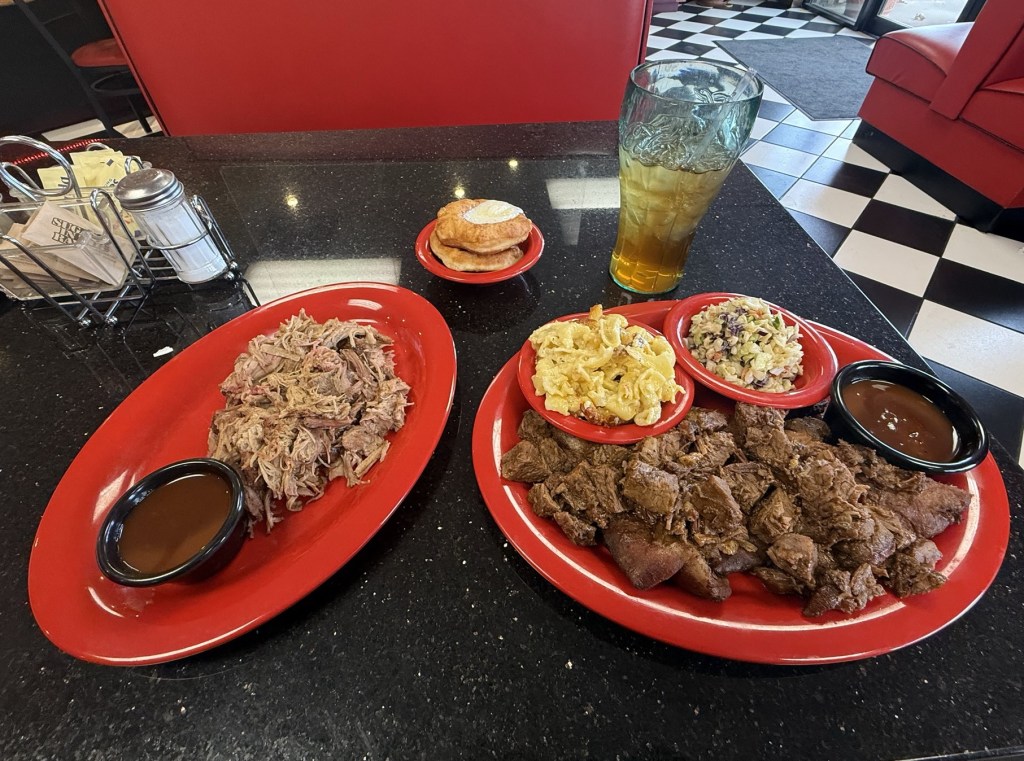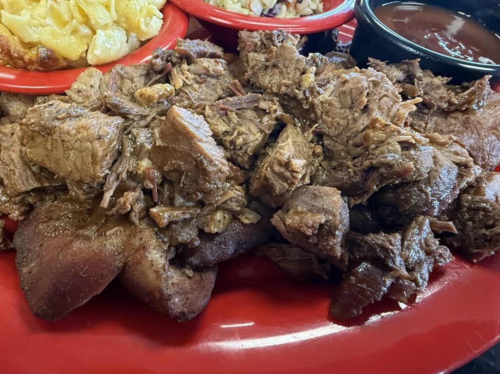 Total Cost: $89.31 with tip. Ordered 1/2 lb of brisket, 1/2 lb of pulled pork, 1/2 slab of ribs, mac & cheese, garlic mashed red potatoes, and 2 Dale’s Pale Ales for drinks