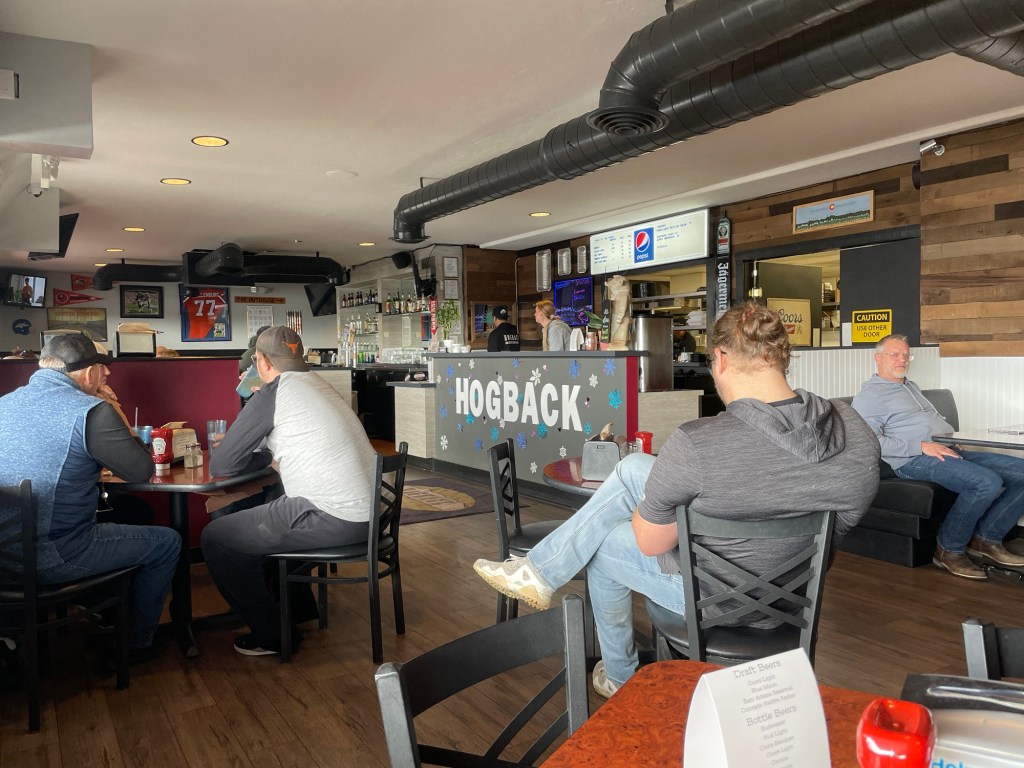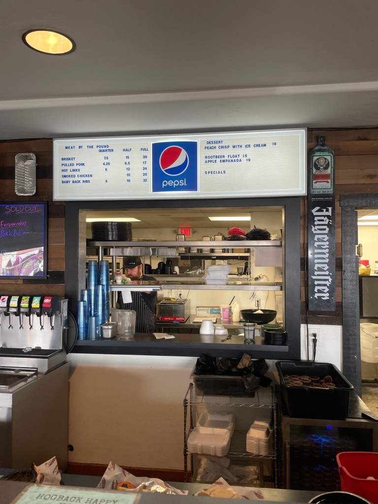 Interior Description: Laid back sports bar themed vibes. Walk up window for ordering your food with several seating options inside and out depending on your preference, with a full bar and the smell of hickory smoke hanging heavy in the air inside or out