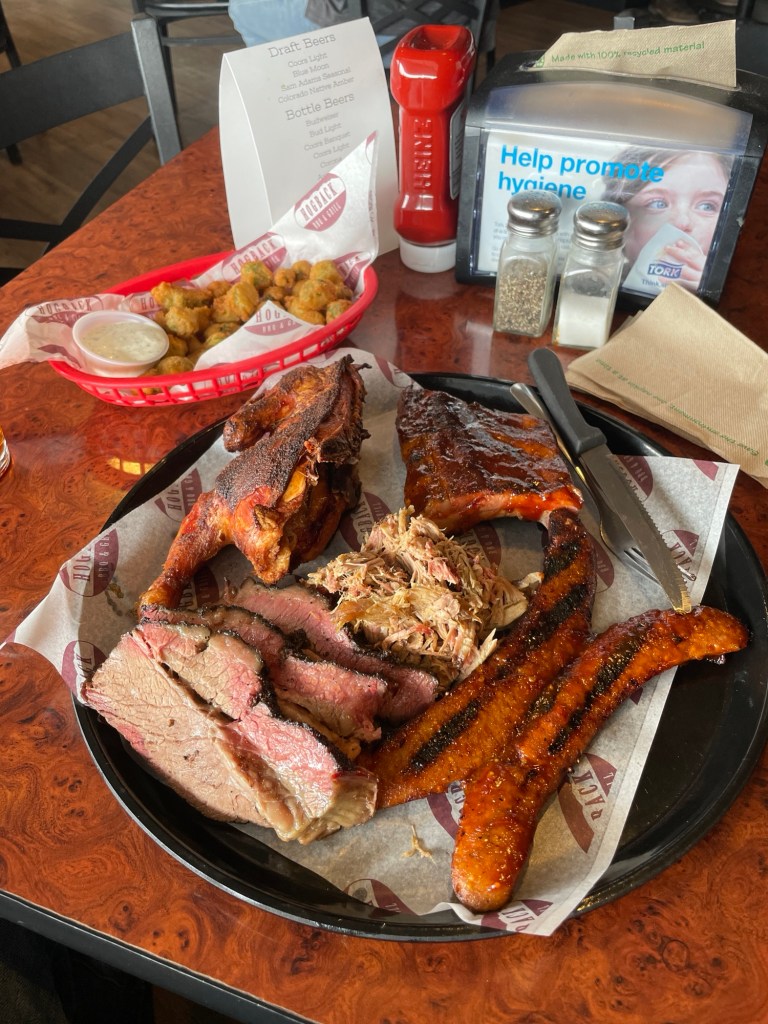 Total Cost: $57.54 pre tax and tip for 1/2 lb brisket, Half rack of Baby Back Ribs, 1/4 lb of pulled pork, 1 hot link sausage, 1/2 chicken, and a Colorado Native Amber