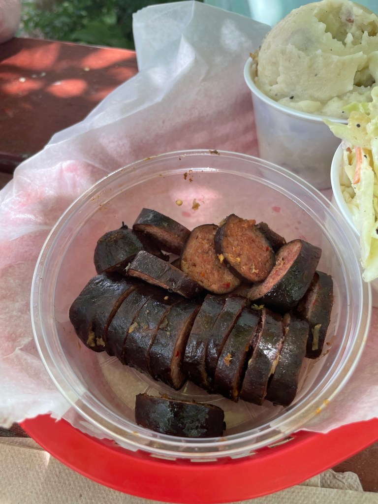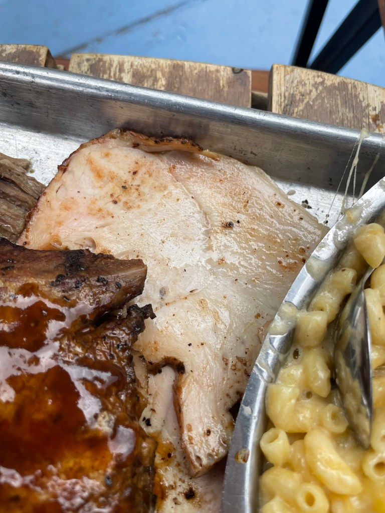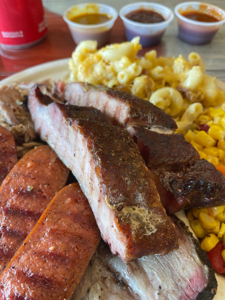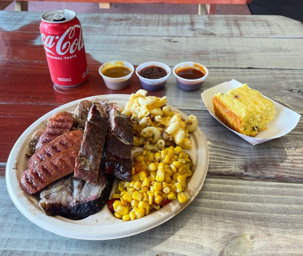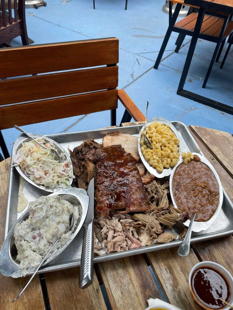 Total Cost: $60.40 with tip. Brisket, ribs, pulled pork, sausage, mac & cheese, coleslaw, and a beer