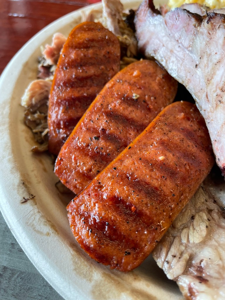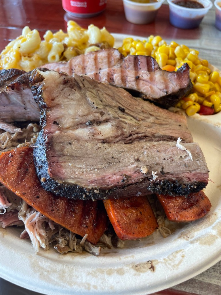 Description: A well-trimmed and thickly cut fatty slice that had a mild smoke ring, but also really good smoke and flavor running through it. While it looked overcooked, the meat was tender and juicy, with a pleasant smoke and seasoning to each bite. It could use a little more pepper, though, to bump it up a rank. But beyond that, a really good brisket, especially for using Pecan wood, which I typically don’t like for beef smokes. Would get again and possibly top 10 in the state