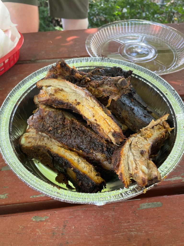 Description: Thinner ribs, but perfectly tender and fall off the bone, while still having a good bite to them. Less smoke flavor than the brisket, but still a nice amount of it. A slightly sweeter rib, and the meat could use a little more flavor to it, but a really good option and I would get it again. Skip the sauces for this one though